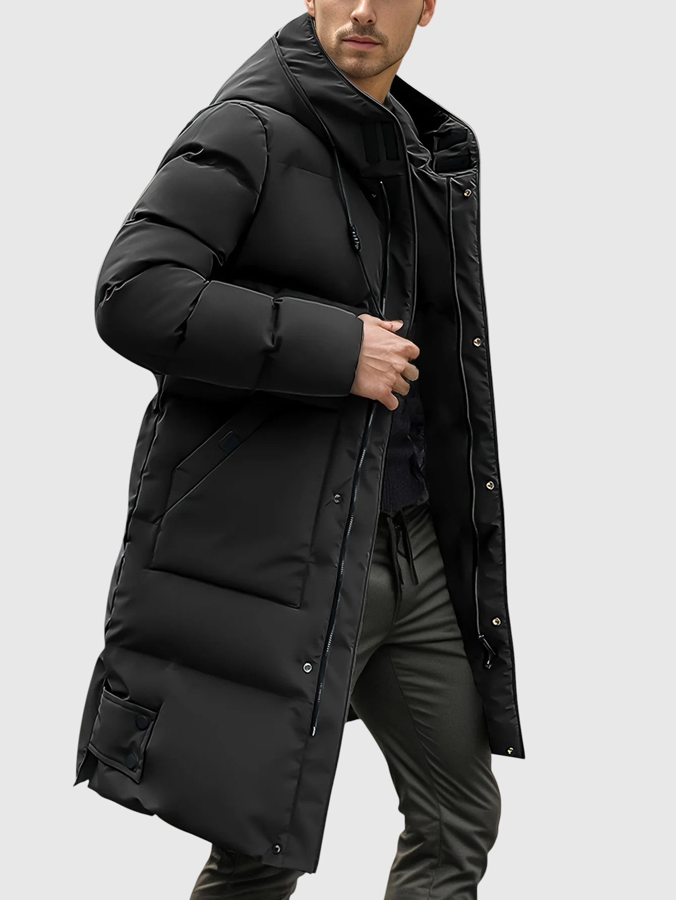 Το μακρύ παλτό με μοντέρνο σχέδιο έχει σχεδιαστεί για να προσφέρει μέγιστη προστασία και άνεση τις κρύες μέρες. Η πουπουλένια επένδυση παρέχει αποτελεσματική μόνωση, ενώ η κουκούλα και ο ψηλός γιακάς ενισχύουν την προστασία από τον άνεμο και τις χαμηλές θερμοκρασίες. Οι λειτουργικοί θήκες και το κλείσιμο με κουμπιά προσθέτουν πρακτικότητα στο κομψό σχέδιο, κάνοντάς το αυτό το άρθρο καθολικό για την αστική ζωή και την ελεύθερη ώρα.